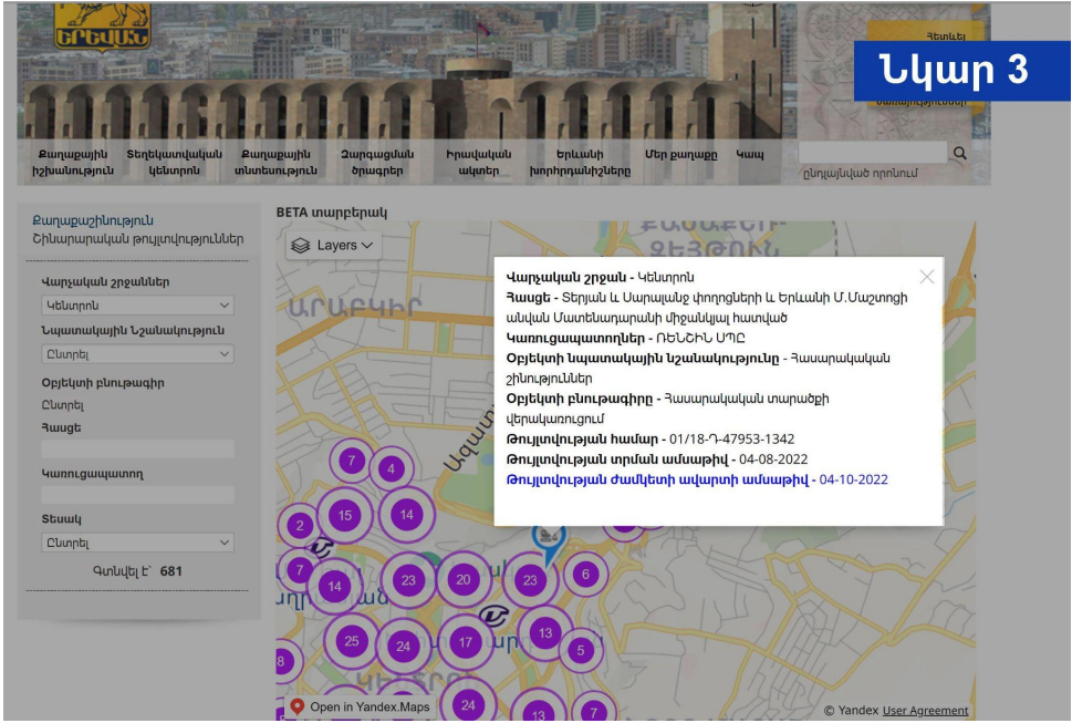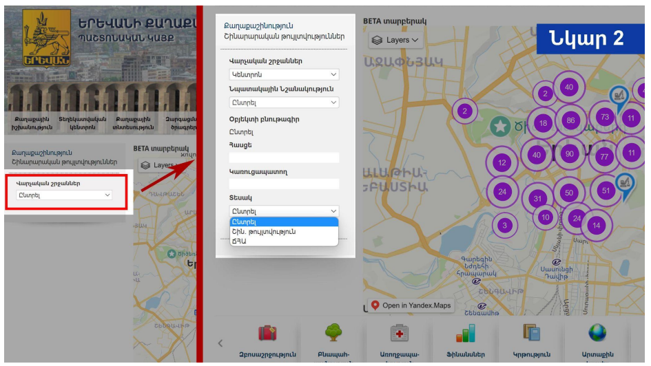 (Photo 1) Already on the left side of the page with the Yerevan city map, in the "Administrative regions" window, select the region, the type of construction (if you know the exact address and the name of the developer, also them), and at the bottom, select "planning permit" or "building permit", after which an image of the construction is marked on the map (Figure 2).